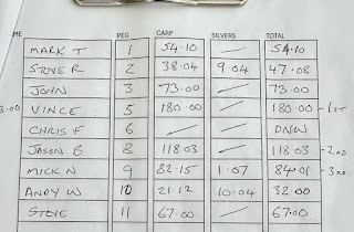 Fished the same rigs as last match. Started on the meat at top set plus two barrels wasn't happy with the meat - not sinking fast enough with some floating? Had about 15 lb and a lost fouler before it died OR the Carp were up in the water waiting for the feed mid water. I'm going to try pumping it next time. Two choices of islands to fish to, the one to the right is overgrown and couldn't get to the shallower water. The island to the right has a nice depth but very stony so careful plumbing required. Could reach both islands with 11.5metres. Went to the right island having fed some 4's and corn with the response was instant catching a few small Carp, plus some foulers. It died far too soon. Had been feeding the RH margin and caught the occasional small Carp and F1's again on corn. Could see the other end bagging up with my end not so much.Weighed 54 lb 4 oz for nowhere. As per usual enjoy it. Had some maggots and on hindsight should have tried them in the LH margin. Me pictured on the run to my peg. Is that Ron in the background looking stressed.Our Pool and the match was won by Paul Elms (pictured with some quality fish) with 115 lb 9 oz from peg 1. Paul caught a few over and short but his LH margin was the most productive catching on maggot over maggot. Well done matey.